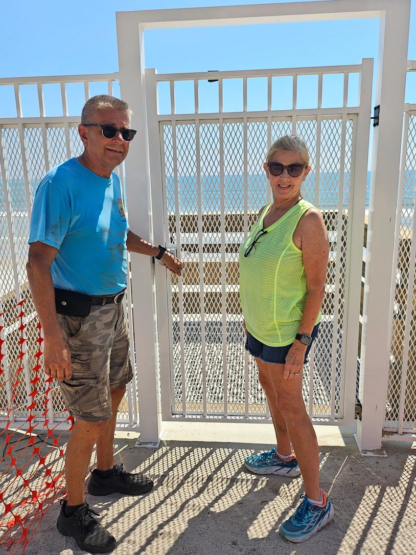 Tim Balas opens gate to beach access and Brenda Balas takes inaugural trip to beach.